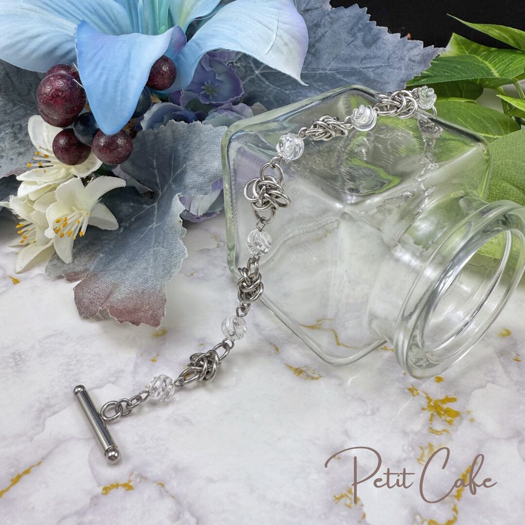 お花に見立てたPersephone Weaveのモチーフに、蕾に見立てたSラインカービングの入った天然石をあわせて、野の花を編んだ花冠をイメージしています。