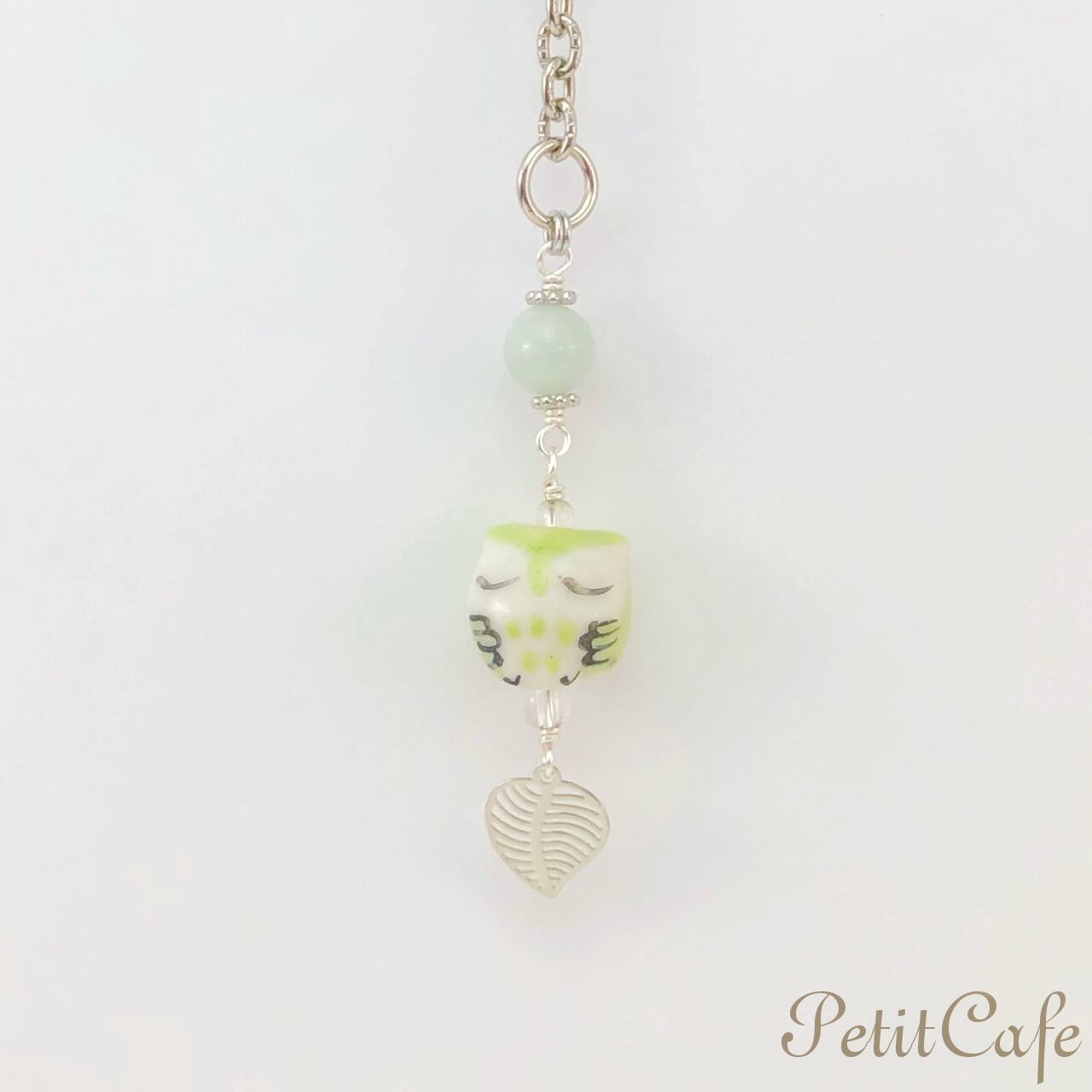 陶器でできた梟(ふくろう)のビーズと天然石(8mm玉)のキーホルダーです。