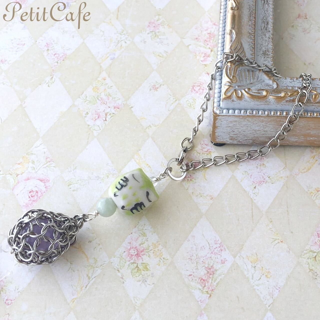 陶器でできた梟(ふくろう)のビーズと、チェーンメイルの雫型モチーフのバッグチャームです。