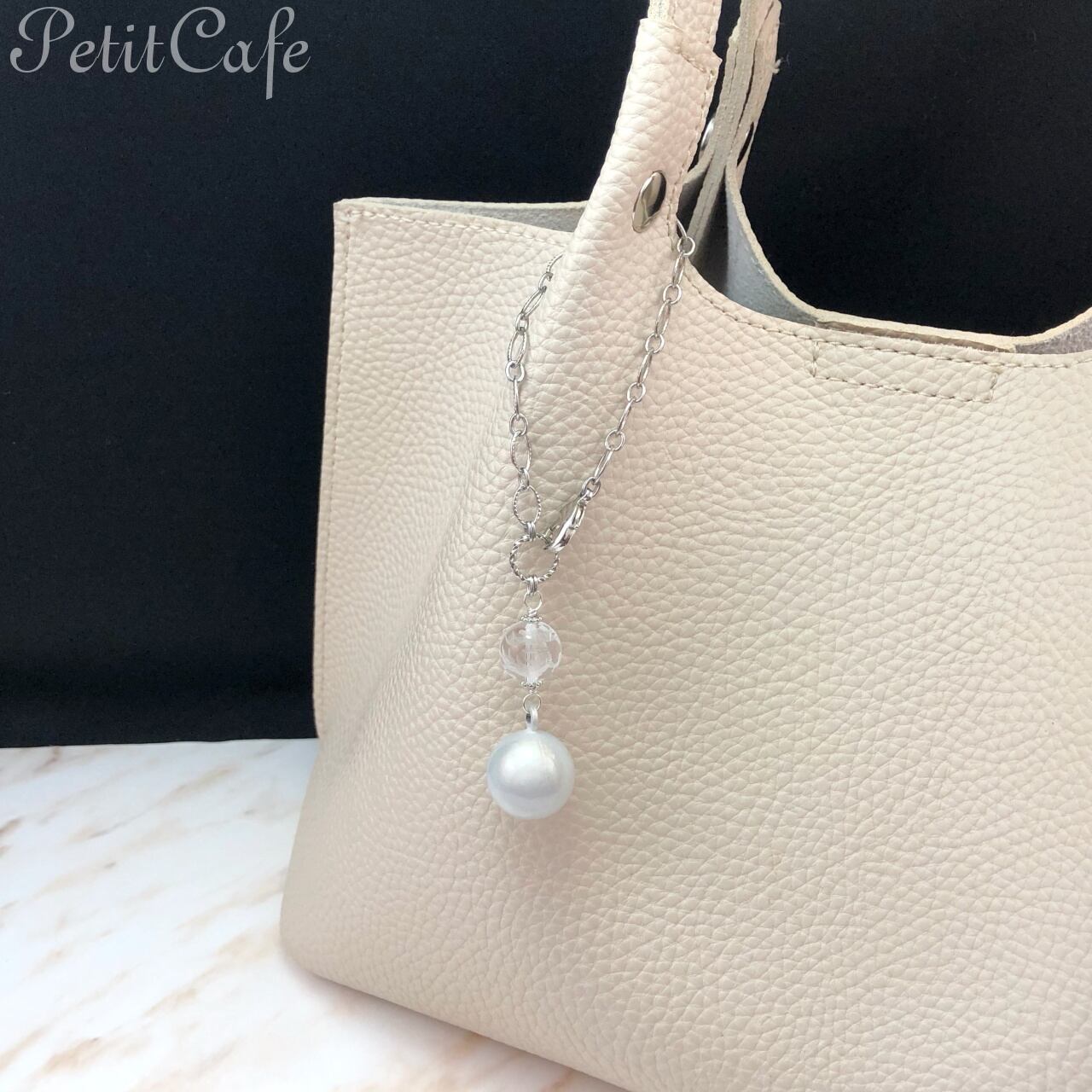 風水四神獣のうち、東を守護する青龍が彫刻された12mm玉の水晶と水琴鈴のバッグチャームです。