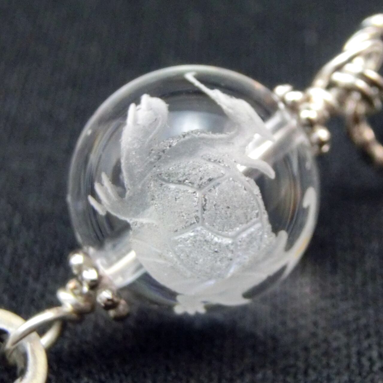 風水四神獣のうち、北を守護する玄武が彫刻された12mm玉の水晶と水琴鈴のバッグチャームです。