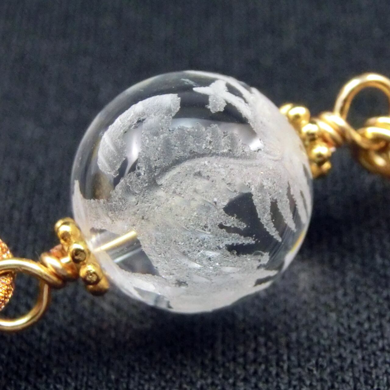 この場合に中央を守護する麒麟が彫刻された12mm玉の水晶と水琴鈴のバッグチャームです。