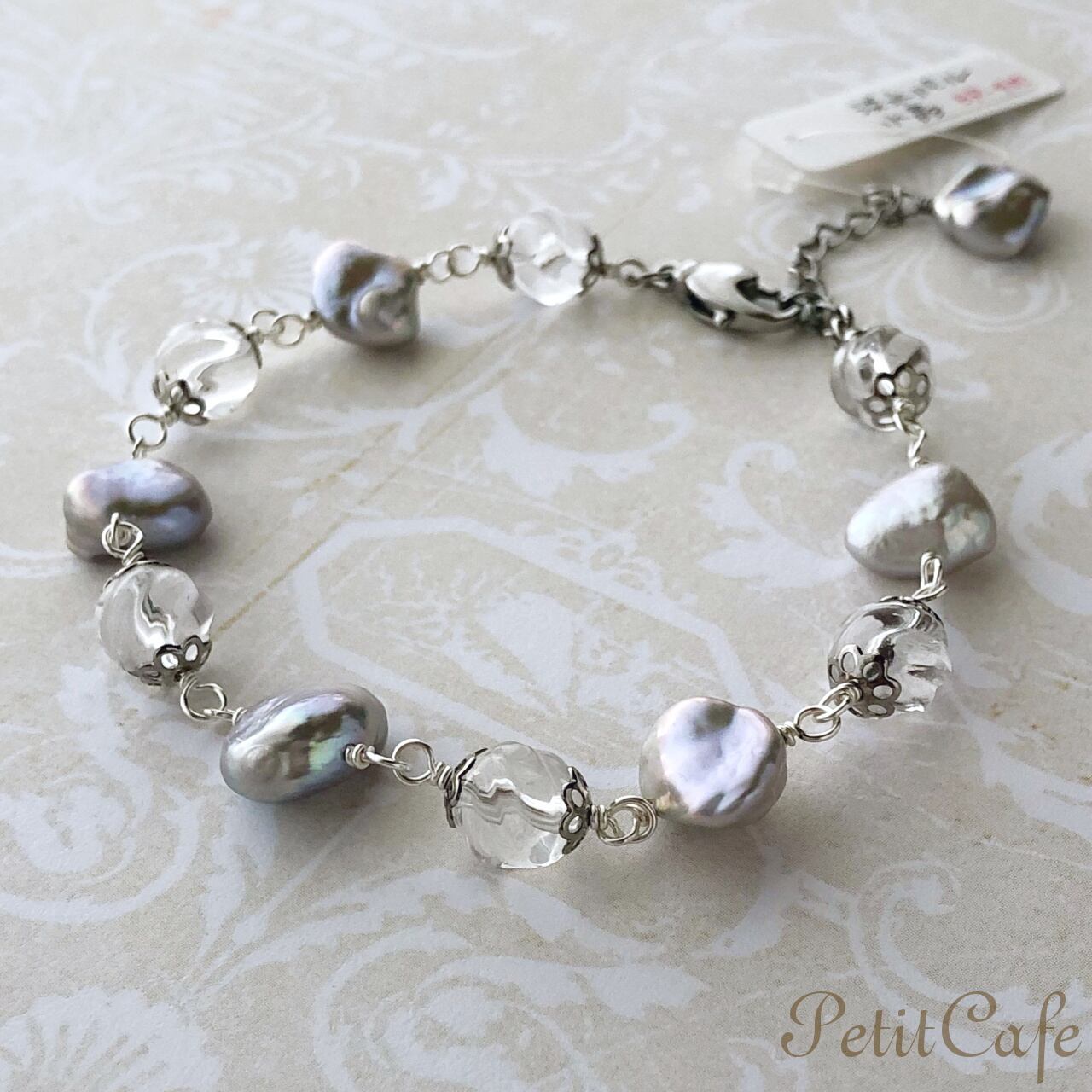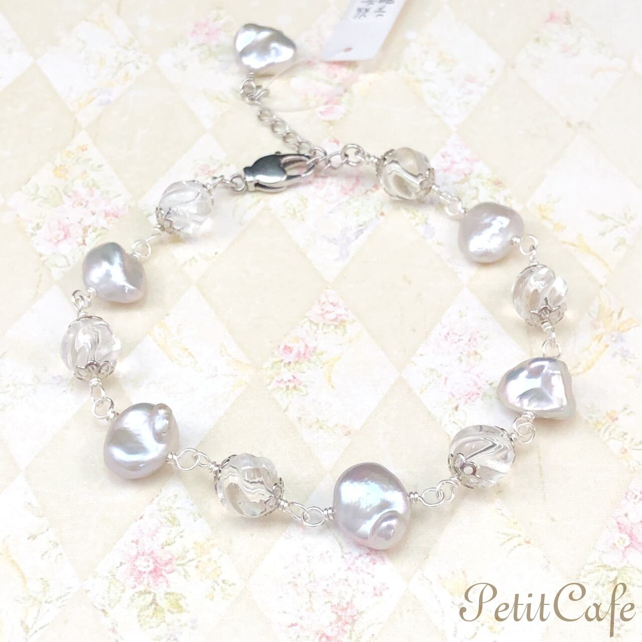 S字カービングの入った8mm玉の水晶と、一つ一つ形が異なるシルバーカラーのケシパール(淡水パール)を繋ぎました。