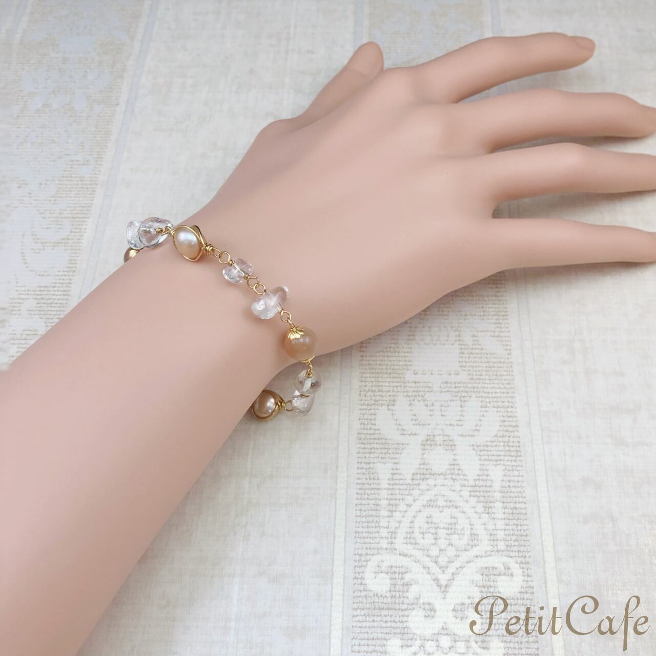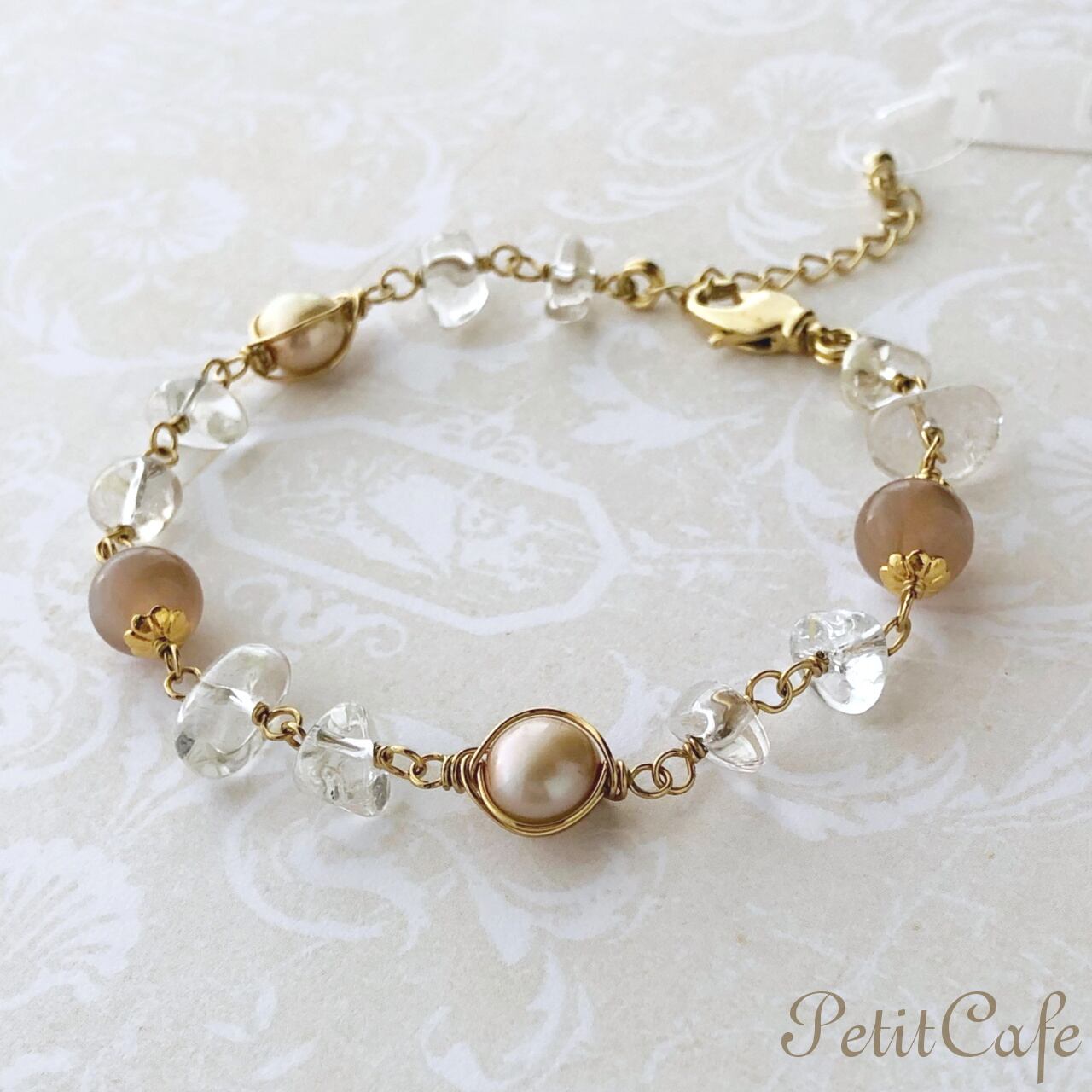 ほぼ無色(ほんの僅かにイエローカラーです)のトパーズのチップと、シラーがとても綺麗なオレンジムーンストーンの8mm玉、照りの良いゴールドカラーの淡水パールを繋ぎました。