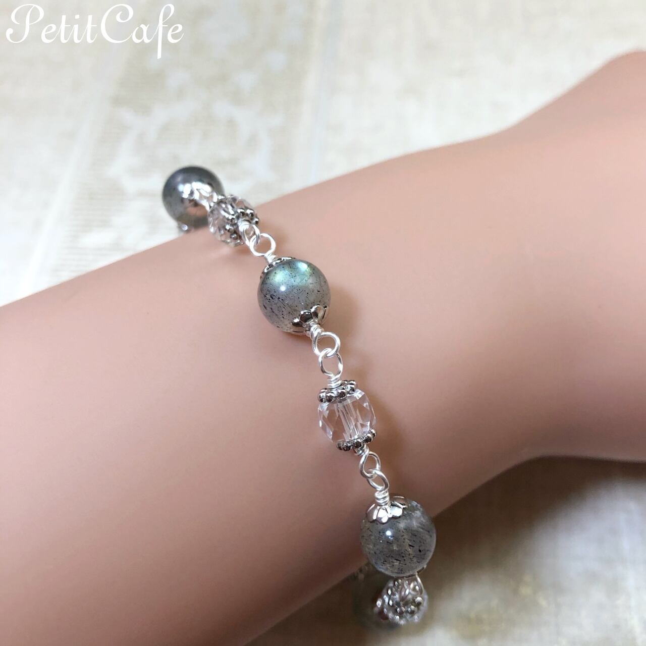 8mm玉のラブラドライトと、キラキラした輝きが綺麗なシリンダーカットの水晶を繋ぎました。