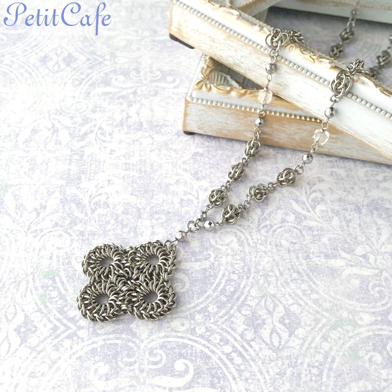 TOPはチェーンメイルのクローバーモチーフで、チェーン部分はチェーンメイルのモチーフと天然石を組み合わせています。