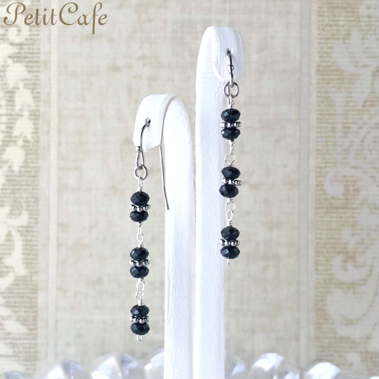 4mmボタンカットのブラックスピネルを繋いだロングタイプのピアスです。