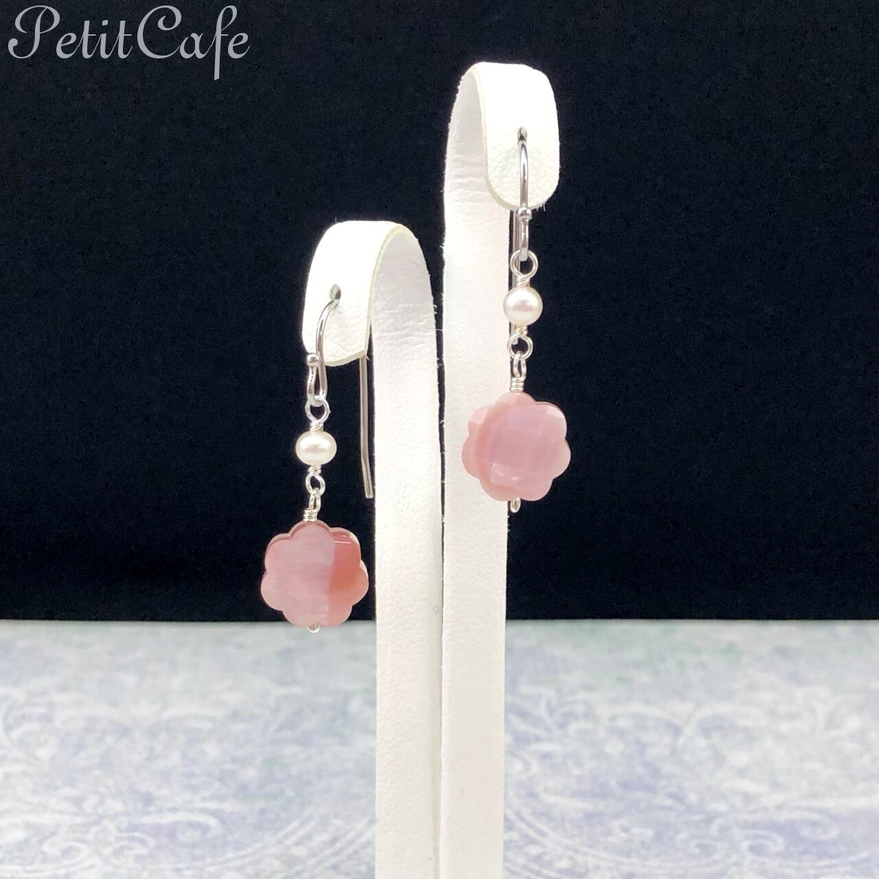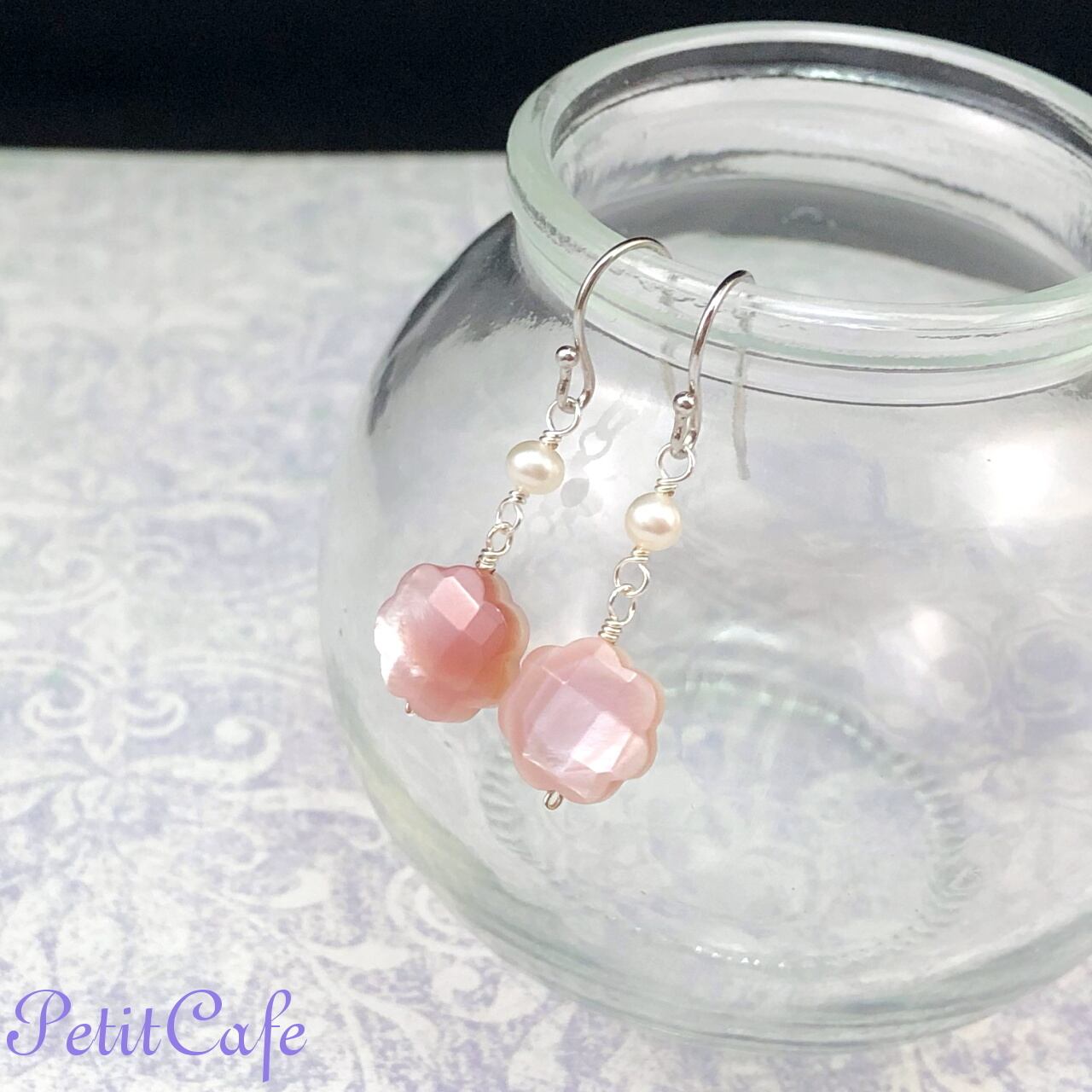 フラワーカット約10mmピンクシェルと、約3.5mm淡水パールを合わせました。