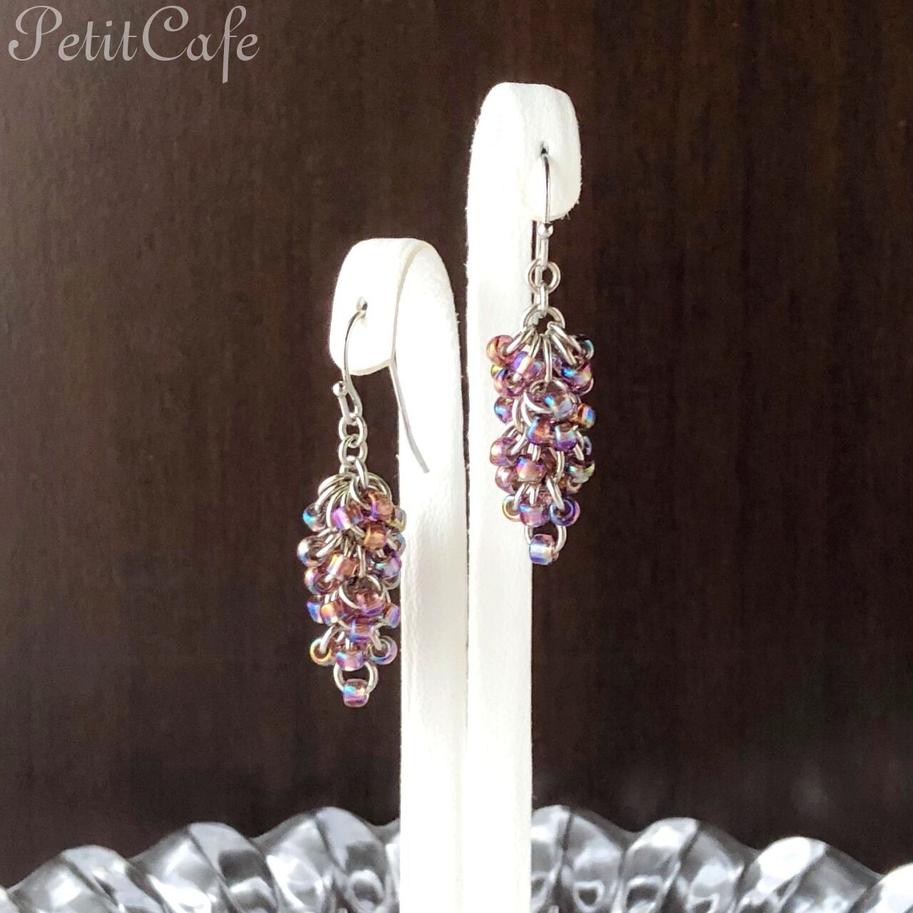 少し変則的なShaggy Loopsという組み方で、丸カンにシードビーズを通して葡萄の房のようなフォルムになるよう仕上げました。