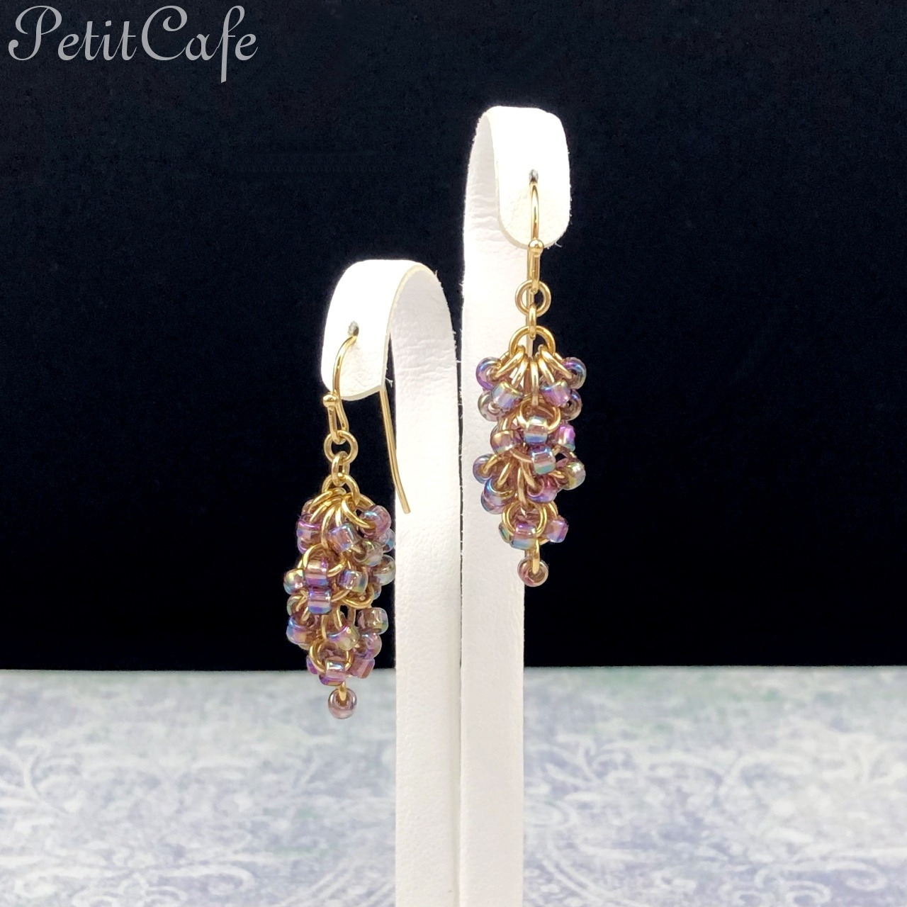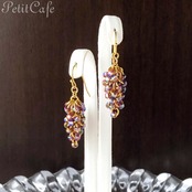 少し変則的なShaggy Loopsという組み方で、丸カンにシードビーズを通して葡萄の房のようなフォルムになるよう仕上げました。