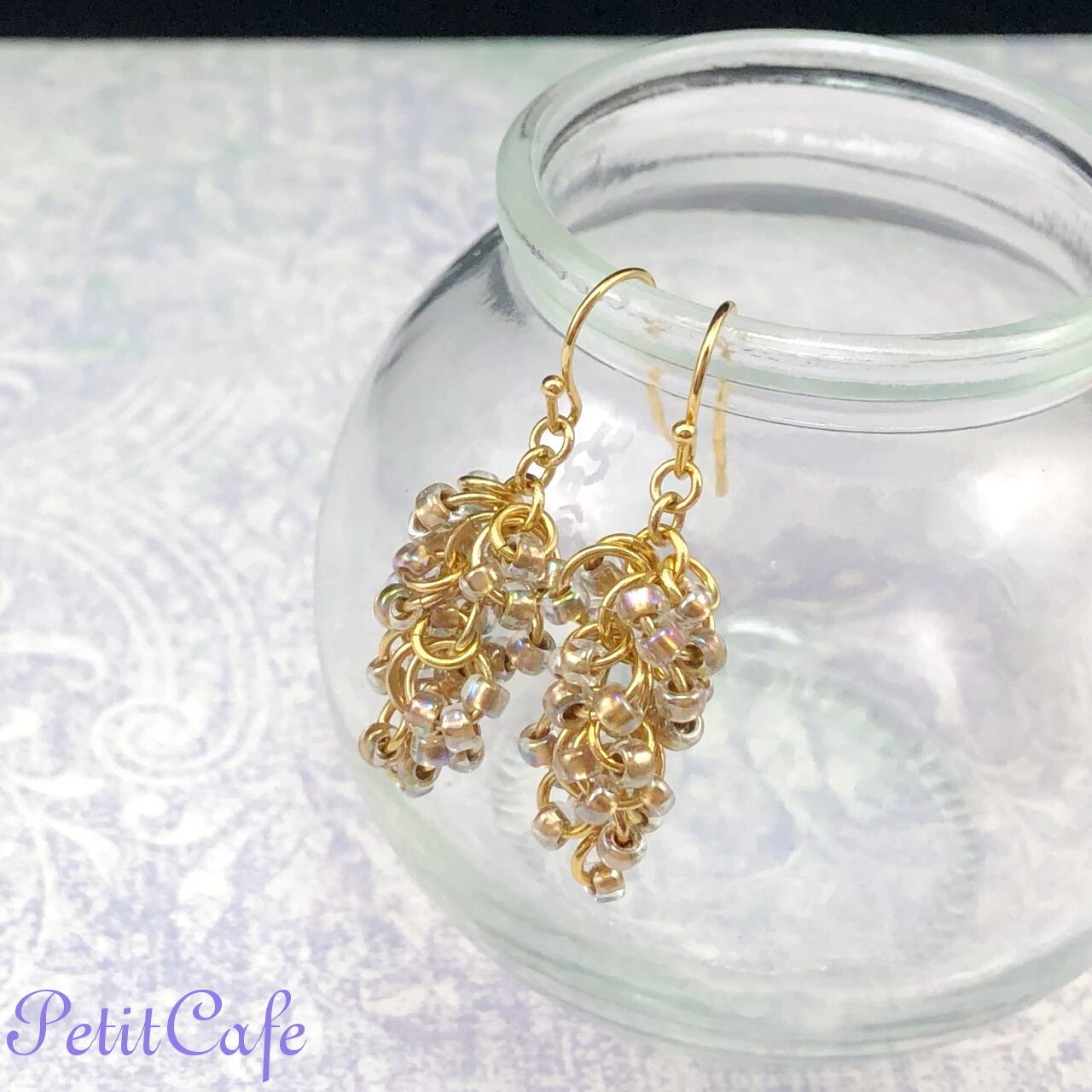 少し変則的なShaggy Loopsという組み方で、丸カンにシードビーズを通して葡萄の房のようなフォルムになるよう仕上げました。