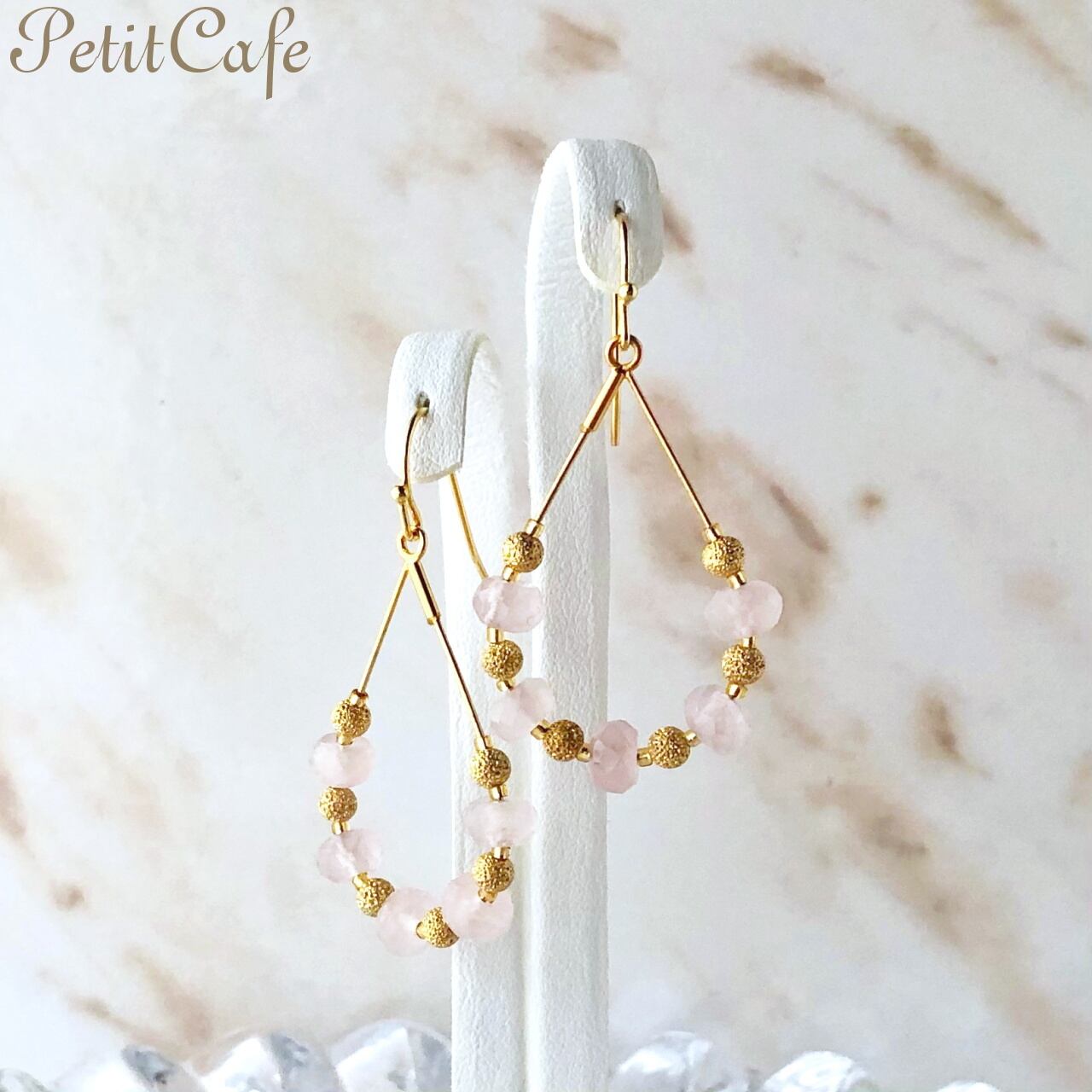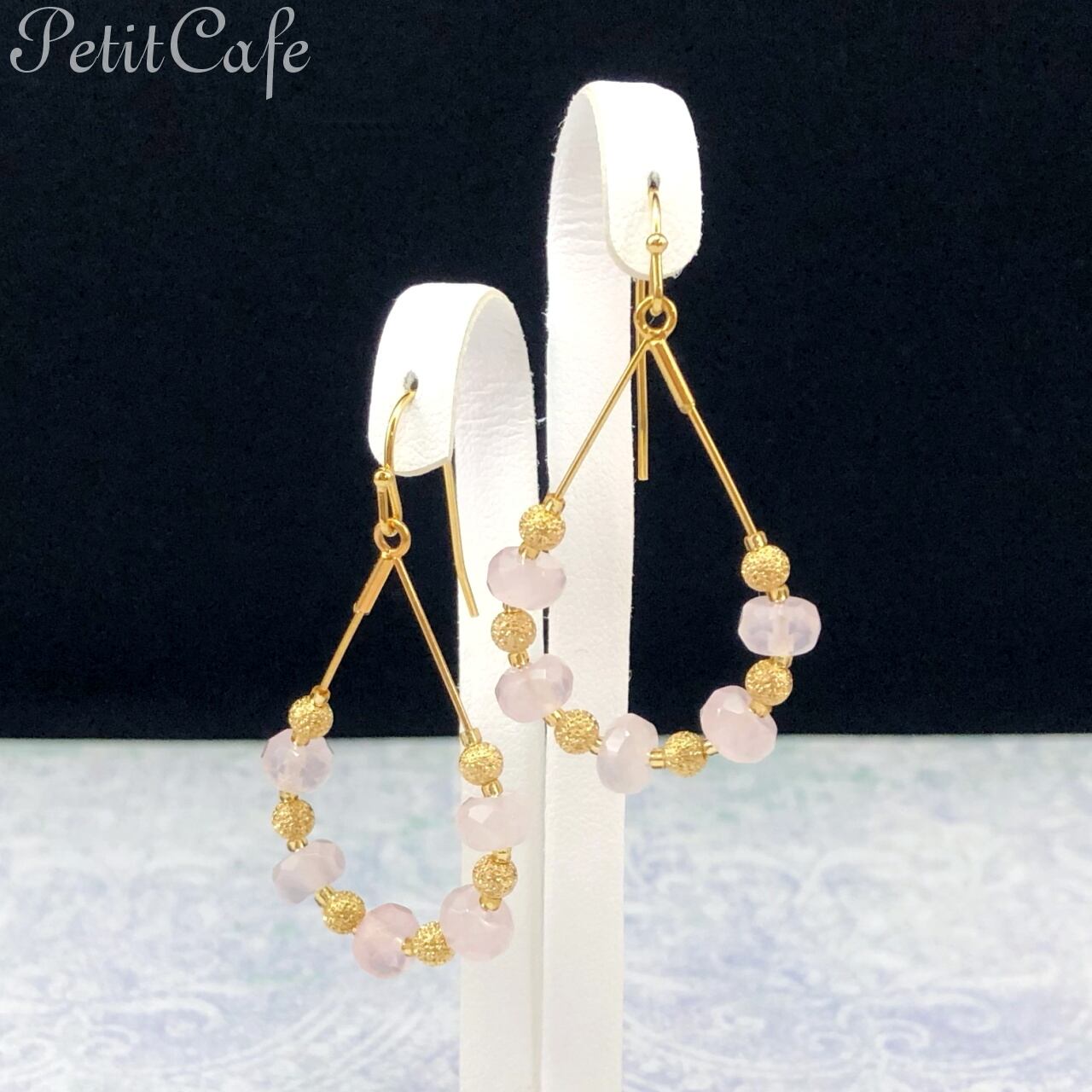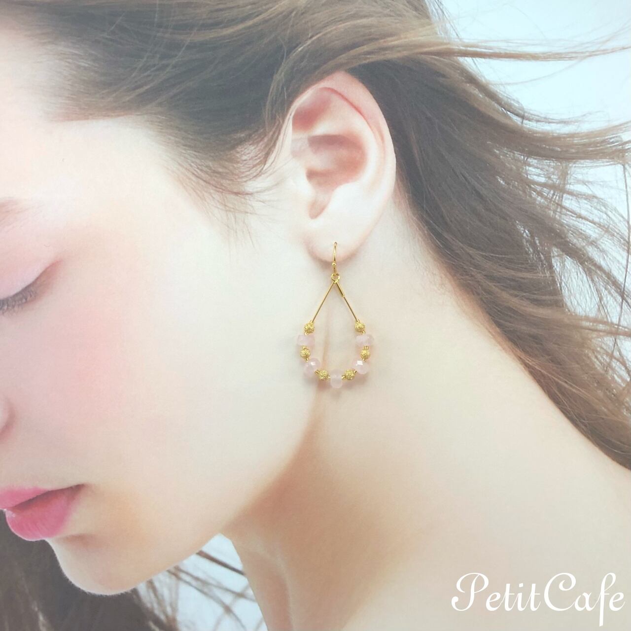 雫型のフープにローズクォーツ6mmボタンカットとメタルビーズを通しています。