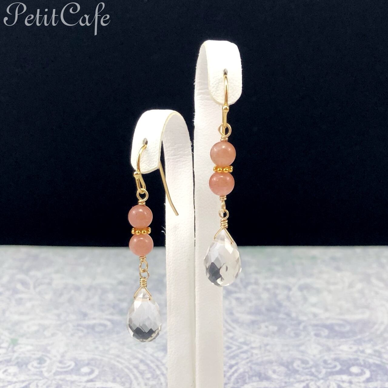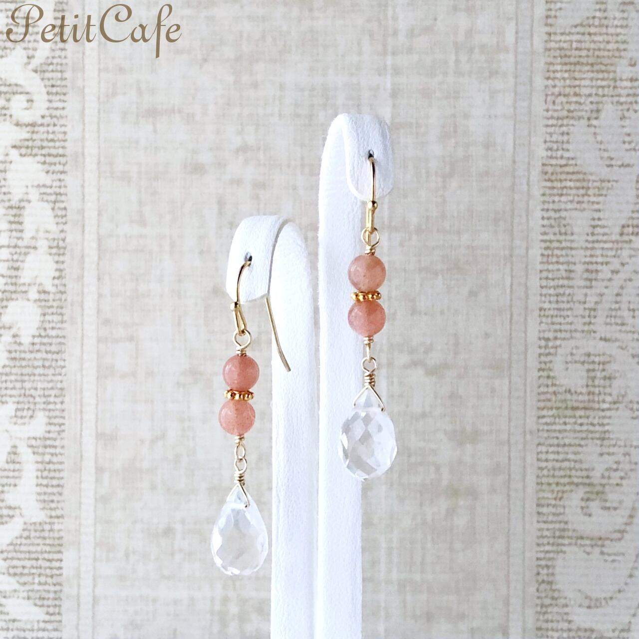 5mm玉のサンストーンと約8mmティアドロップカットの水晶を合わせました。