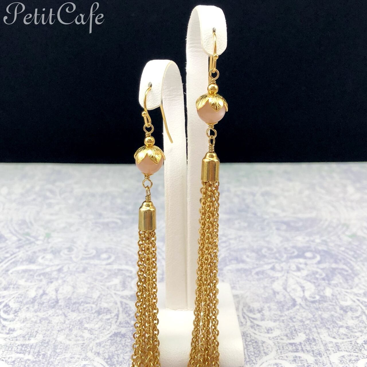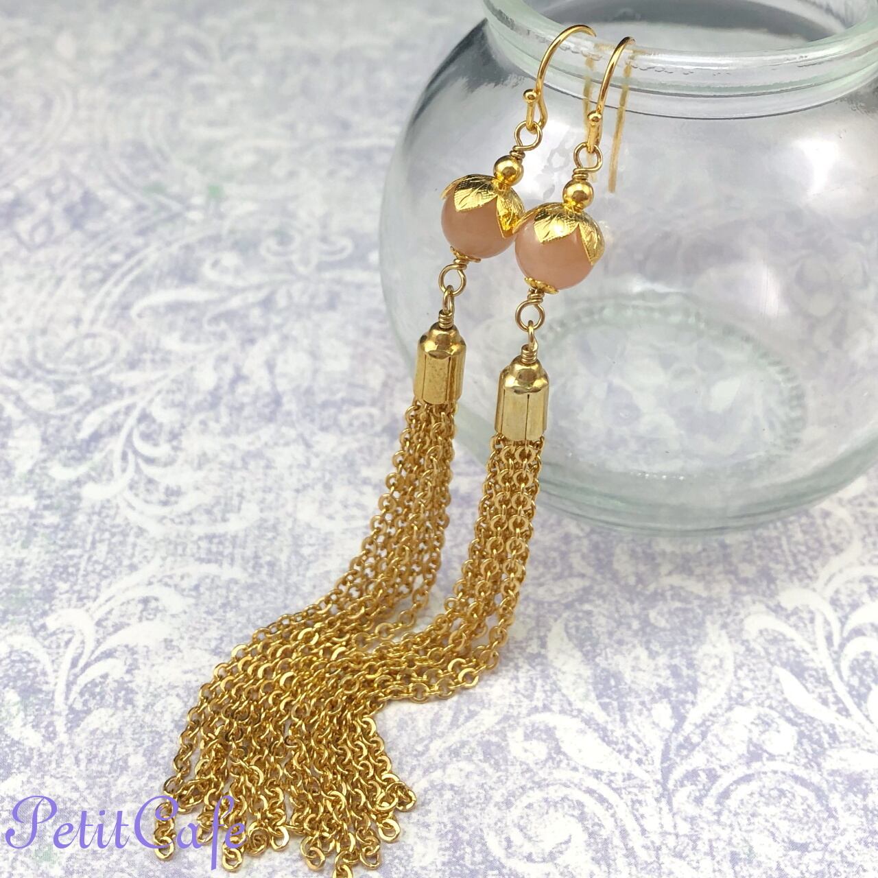 オレンジムーンストーンとタッセルのロングピアス<PI-585>
