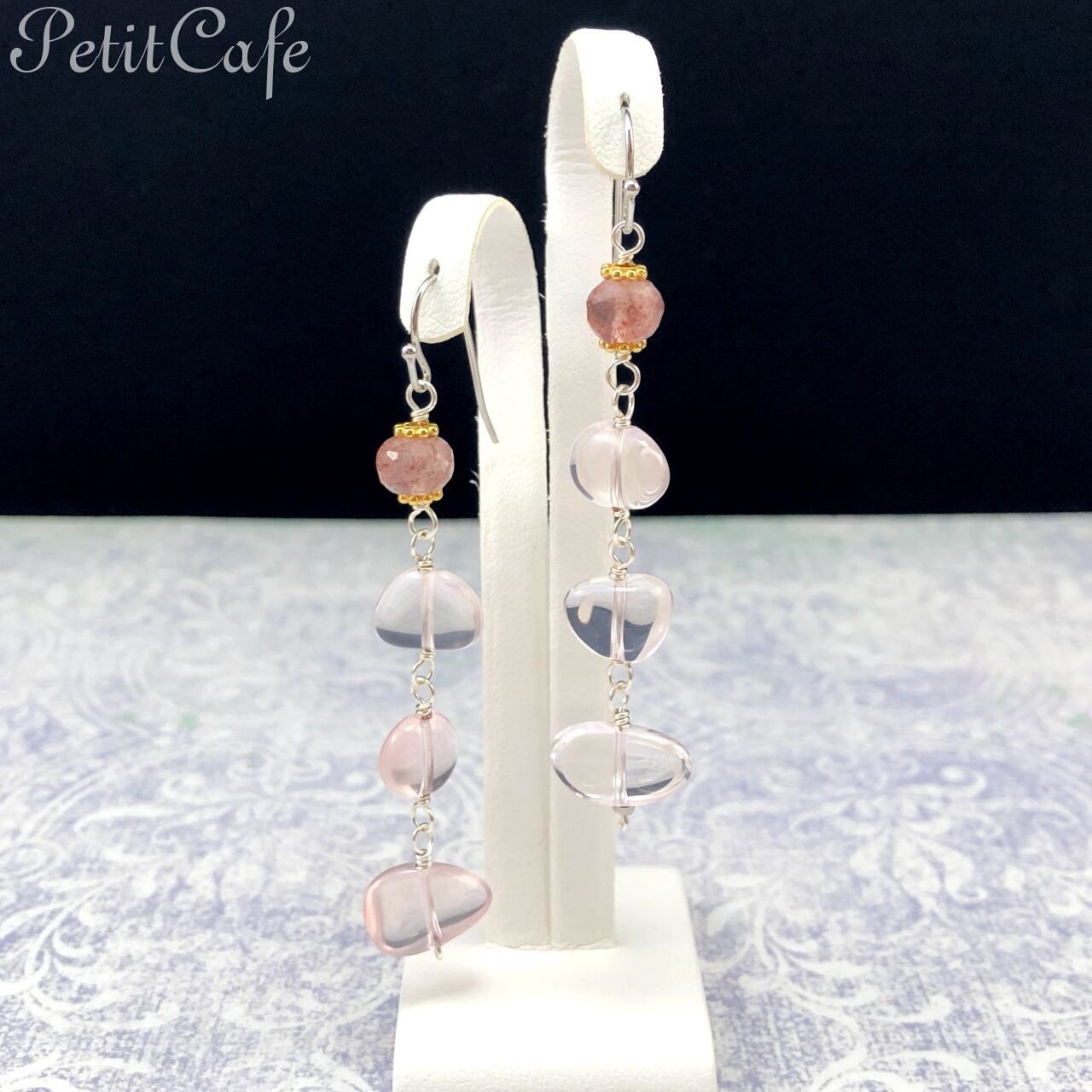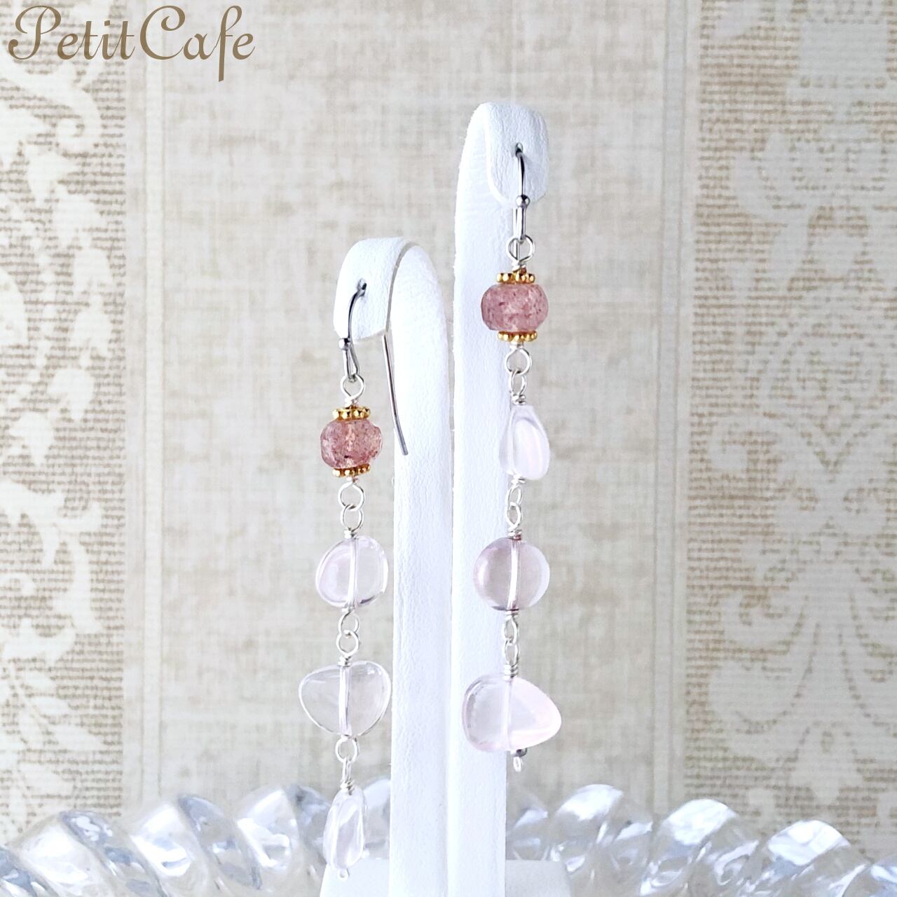 ほんのりミルキーな淡いピンクのローズクォーツと、7mmボタンカットのストロベリークォーツを合わせました。
