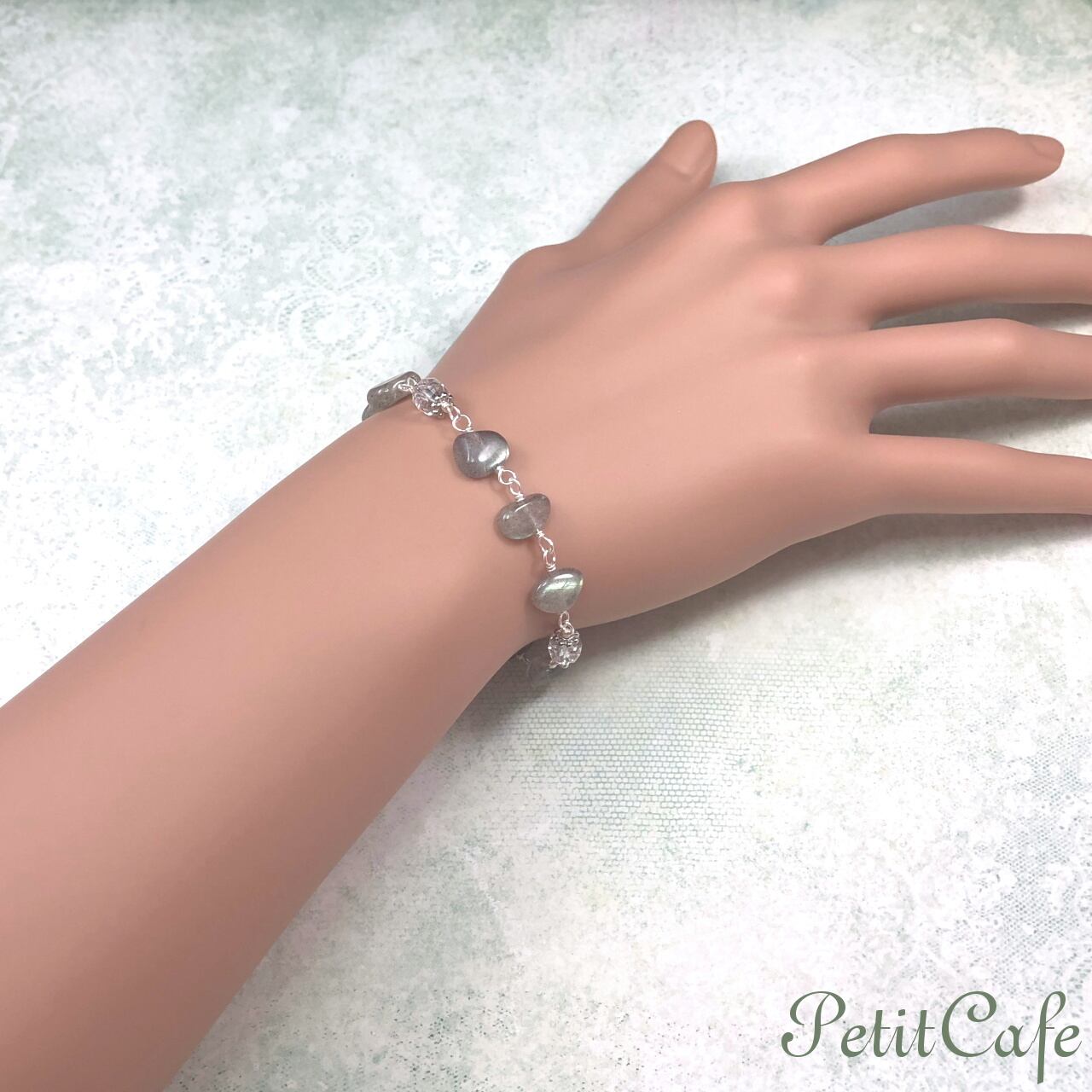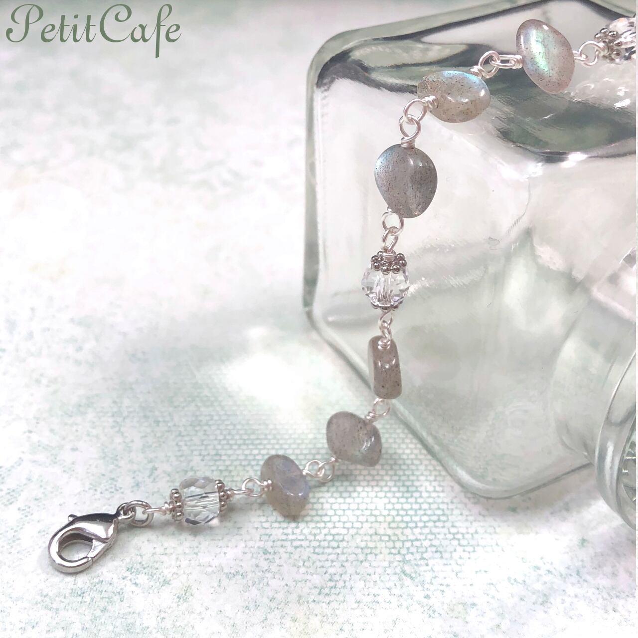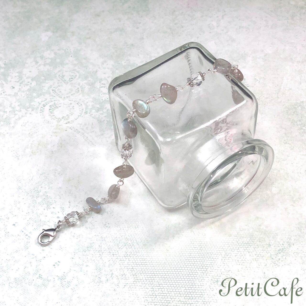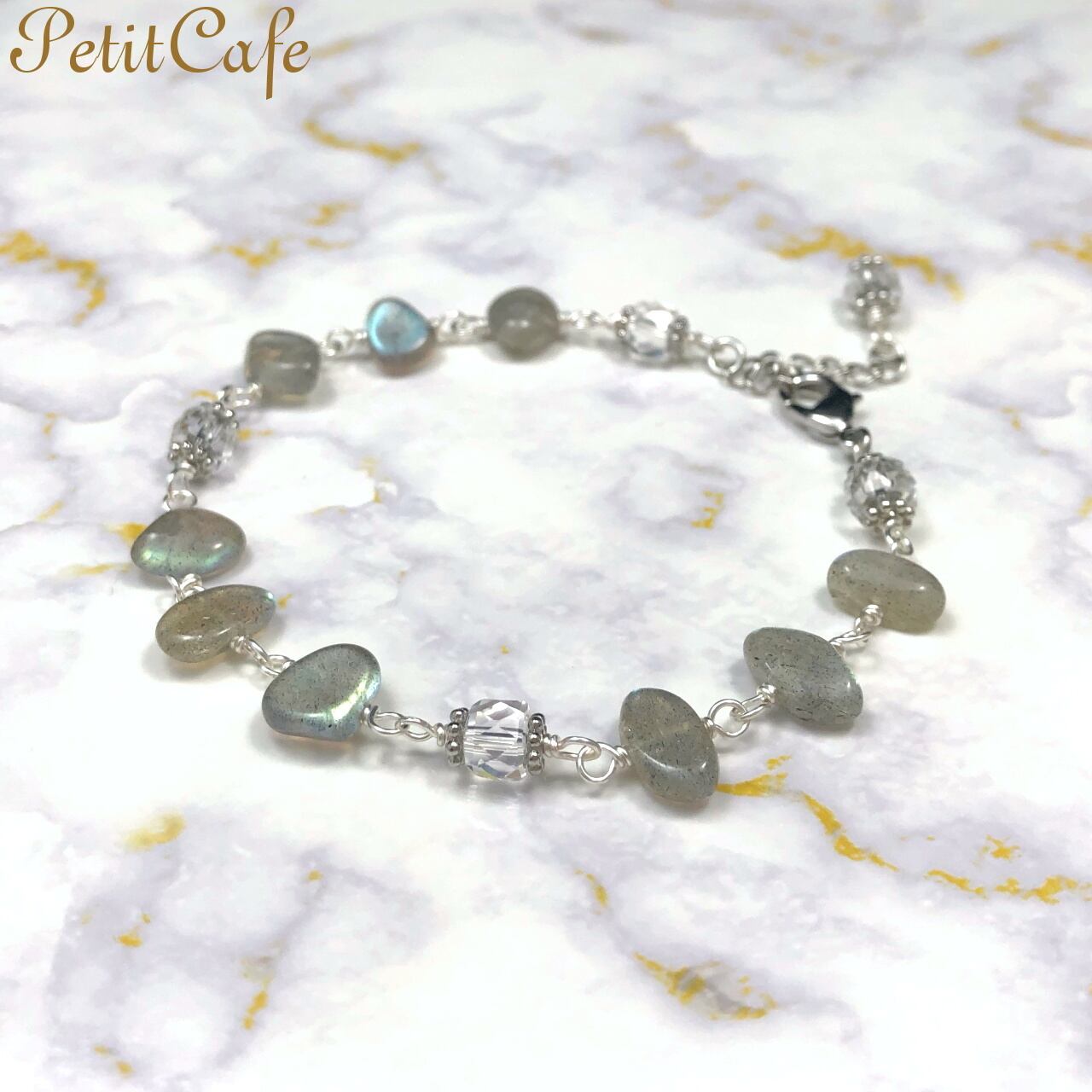 ラブラドライトのチップと、キラキラした輝きが綺麗なシリンダーカットの水晶を繋ぎました。