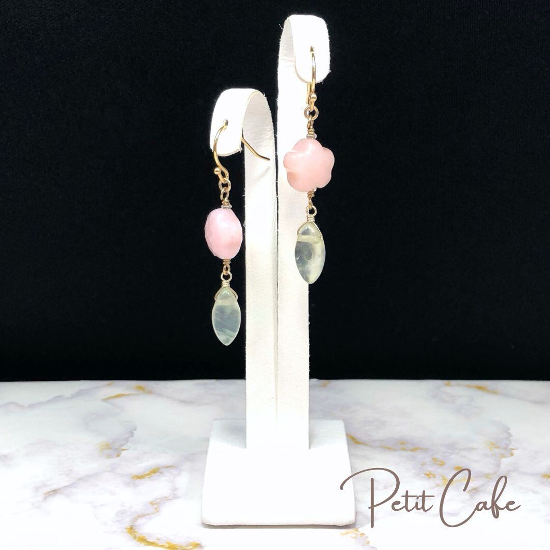 フラワーカットのピンクオパールとマーキス型のプレナイトを合わせました。