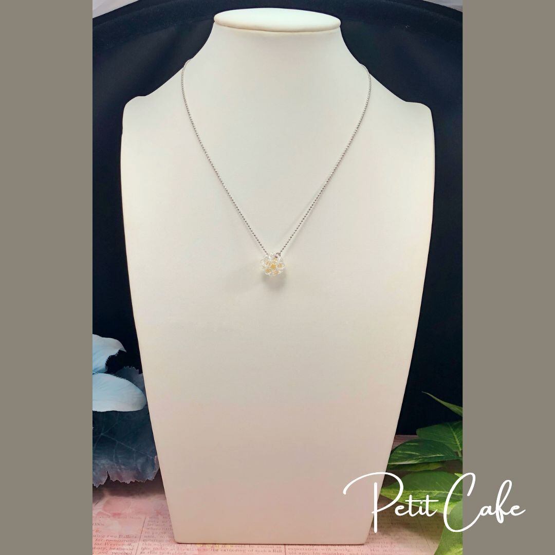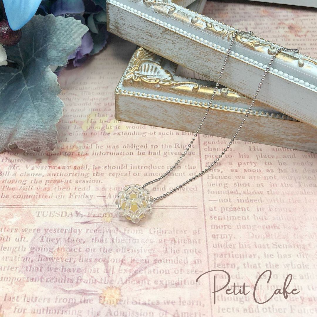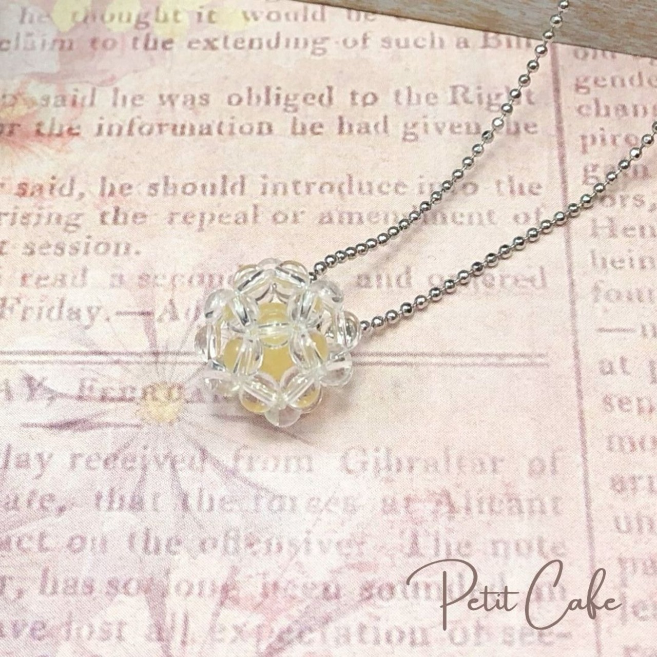 3ミリの水晶をテグスで編んだボールの中に黄色のクォーツァイトを閉じ込めました。