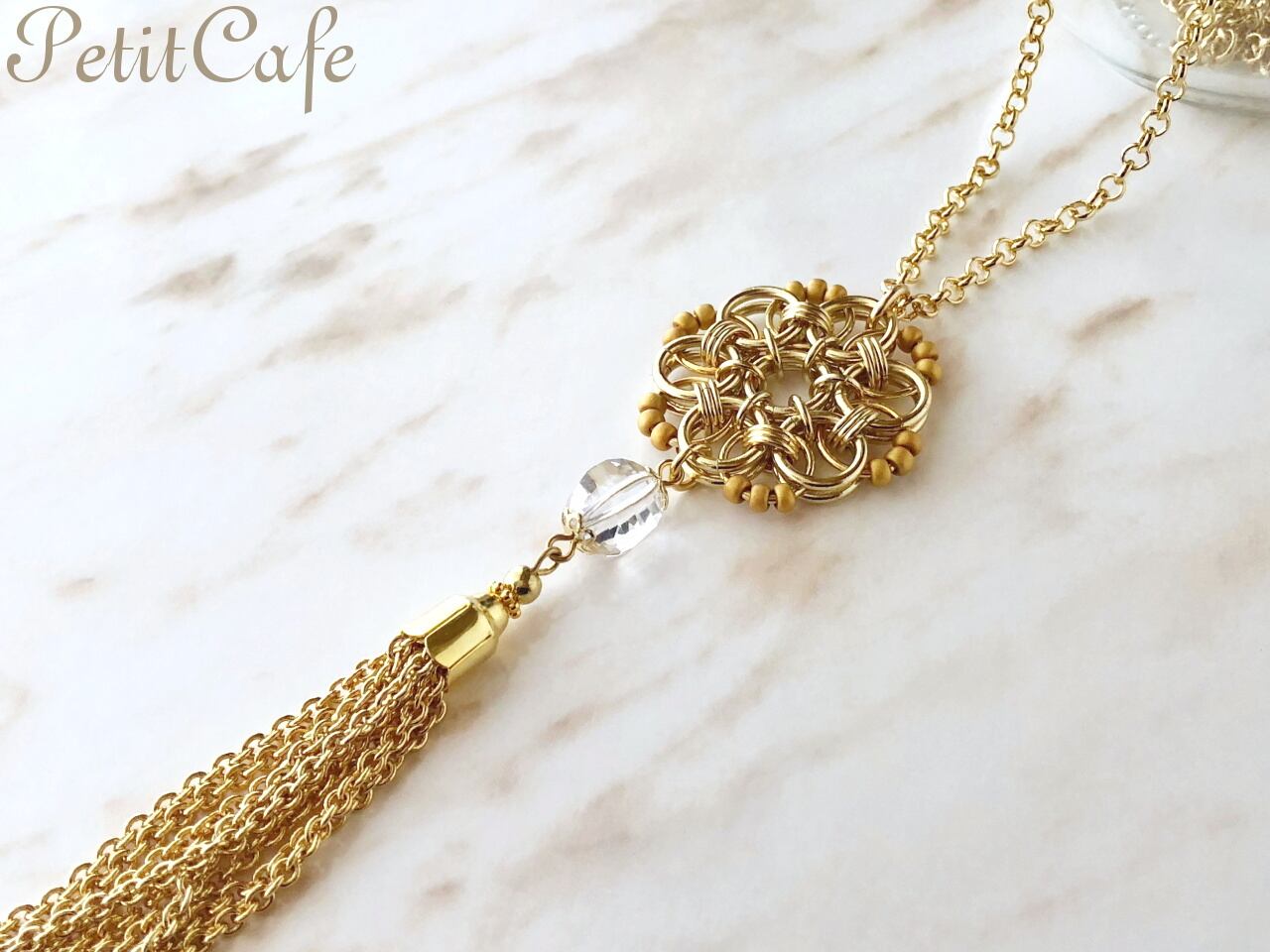 Helm Weave のフラワーモチーフに綺麗なツイストカットが入った水晶とチェーンタッセルをあわせたロングタイプのペンダントです。
