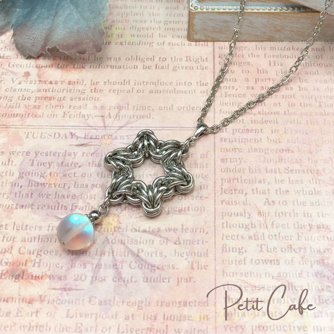 ヘキサゴン(六角形)のチェーンメイルモチーフに10mm玉のルナフラッシュ(ガラスビーズ)をあわせました。