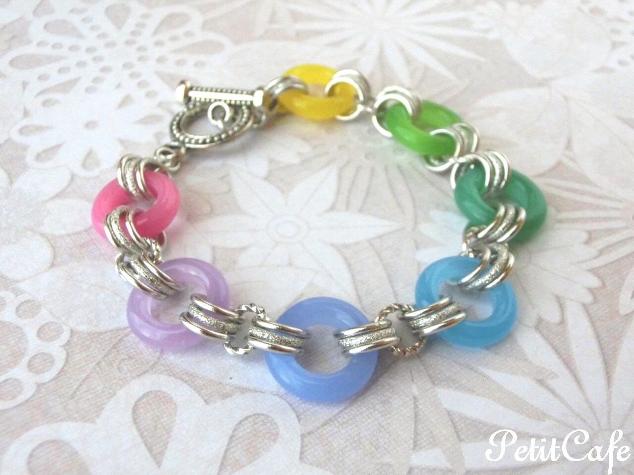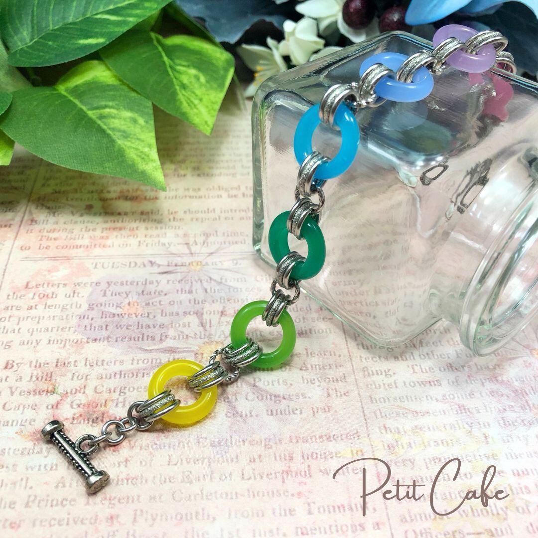 カラフルなガラスのリングをシンプルに繋ぎました。