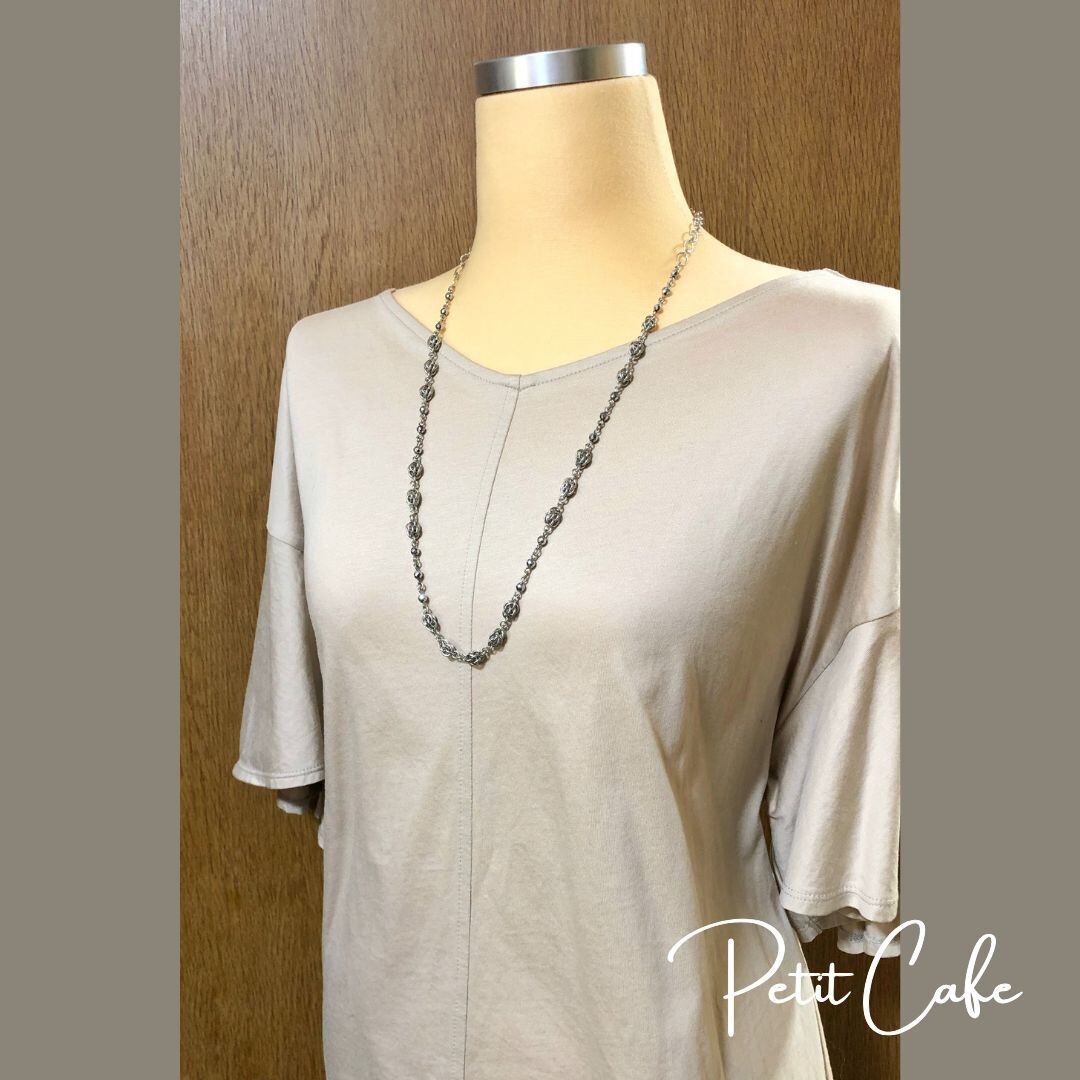 片方のチェーンがアジャスターも兼ねて長くなっていて、好きなところで留めるタイプです。