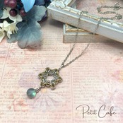 2色の丸カンで組んだヘキサゴン(六角形)のチェーンメイルモチーフに10mm玉のルナフラッシュ(ガラスビーズ)をあわせました。
